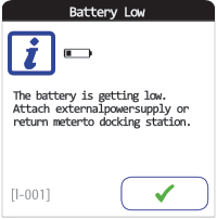 Battery Low | Attach the external power supply or place the meter in its docking station. |