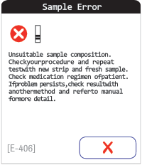 Sample Error | Unsuitable sample composition or interference. Check procedure and patient medication; repeat test with new strip and fresh sample. If it persists, verify result using another method. |