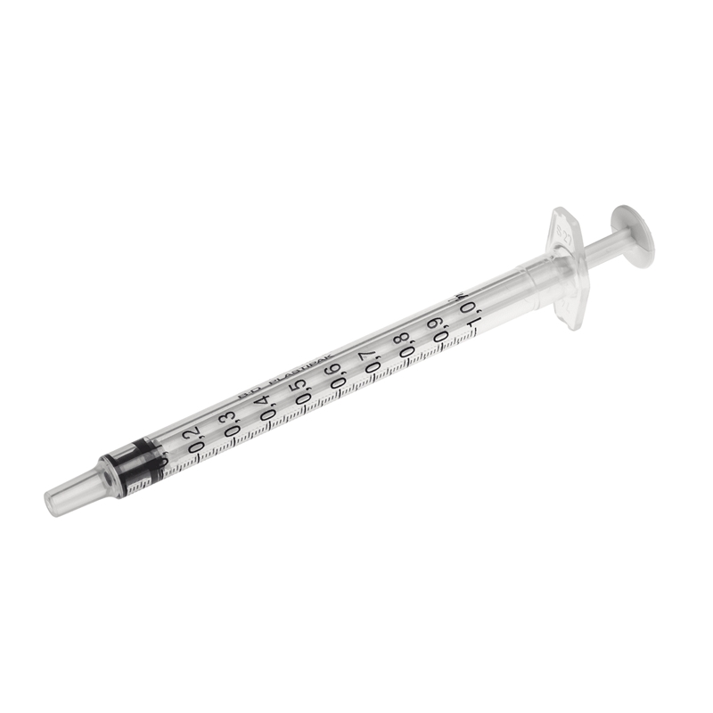 Sterile, single-use plastic syringes with Luer Slip tip.