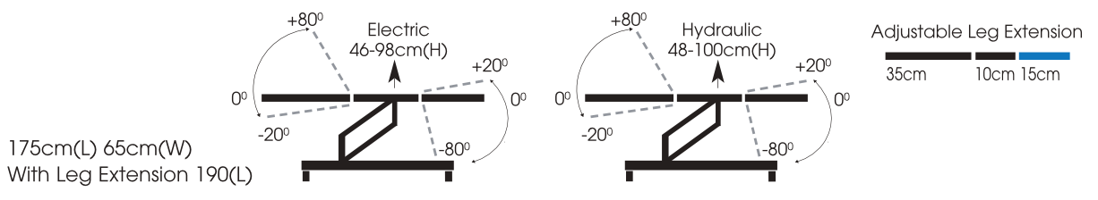 Fusion Podiatry Chair with Electric or Hydraulic height adjustment, with gas or electric assisted head and split adjustable length foot sections.