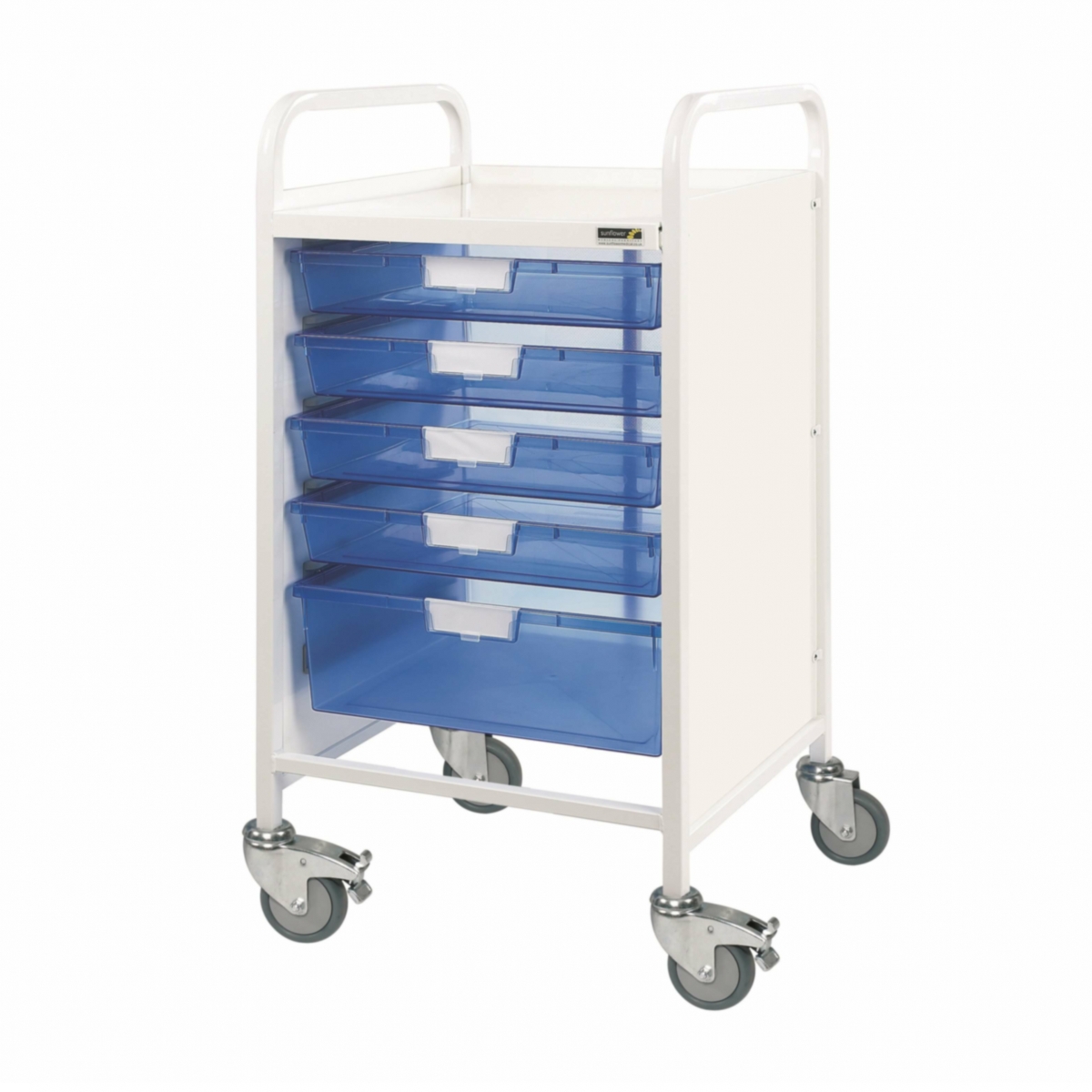 The Sunflower Medical standard size medical/storage trolley featuring 4 single depth and 1 double depth trays is ideal for general purpose use in a range of healthcare environments including hospitals, health centres and GP surgeries.